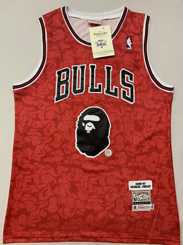 97-97公牛23队#乔丹黑红条复古洞布球衣